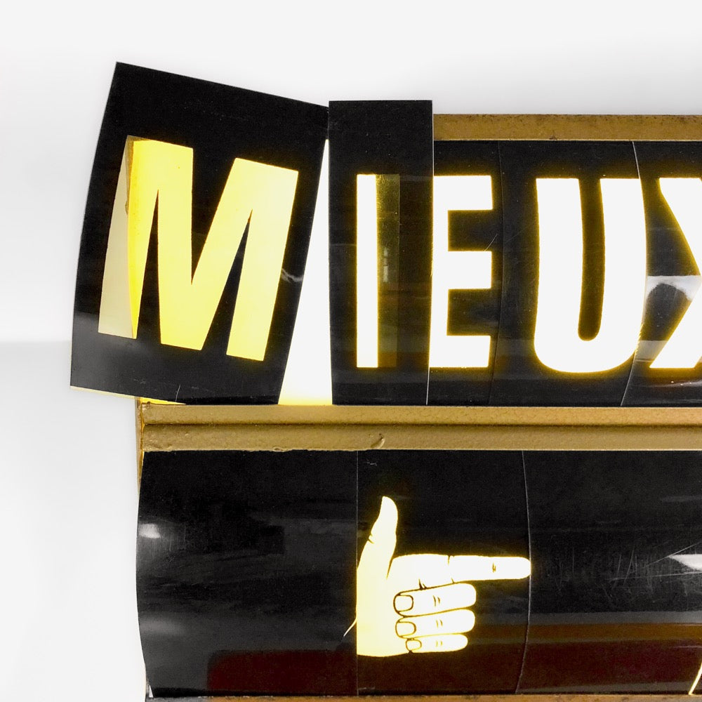 Cette grande enseigne lumineuse unique est une perle rare d'une originalité folle. Elle trônait sur le comptoir d'une boutique de mode des années 70. Elle a été remisée pendant plusieurs décennies et pourtant elle fonctionne comme au premier jour. Son caisson à la structure en métal galvanisé est scindé en deux parties dans lesquelles est inséré un néon. Les lettres en plastique rigides sont amovibles, permettant ainsi une formule personnalisable à l'envie. Il parait possible de confectionner soi-même d'autres lettres.
