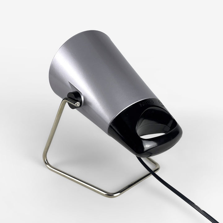 Son boitier conique est en aluminium laqué argent et en bakélite noire. Il est inclinable sur un support chromé. Son look futuriste en fait un objet design que l'on peut sans hésiter laisser sur place après utilisation.
