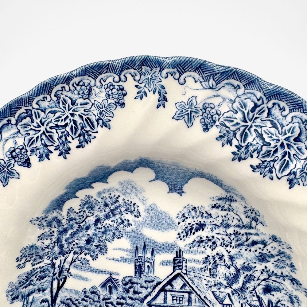 Fabriqué dans le Staffordshire en Angleterre, ce modèle présente comme décor, une charmante scène rurale typiquement britannique : un cottage au bord d’une rivière, entouré de verdure avec des détails richement illustrés. Le tout dans une teinte bleue qui contraste avec le glacis blanc.