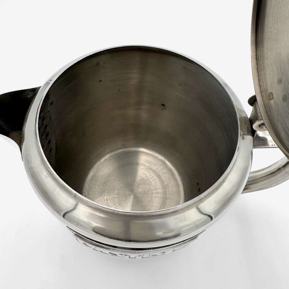 Sa silhouette sobre et fonctionnelle, associée à son couvercle articulé et à son bec verseur précis qui retient les glaçons, en fait un bel exemple d’accessoire de bar professionnel des décennies passées. Le logo en relief, apposé sur la face avant, souligne l’identité graphique emblématique de la marque.