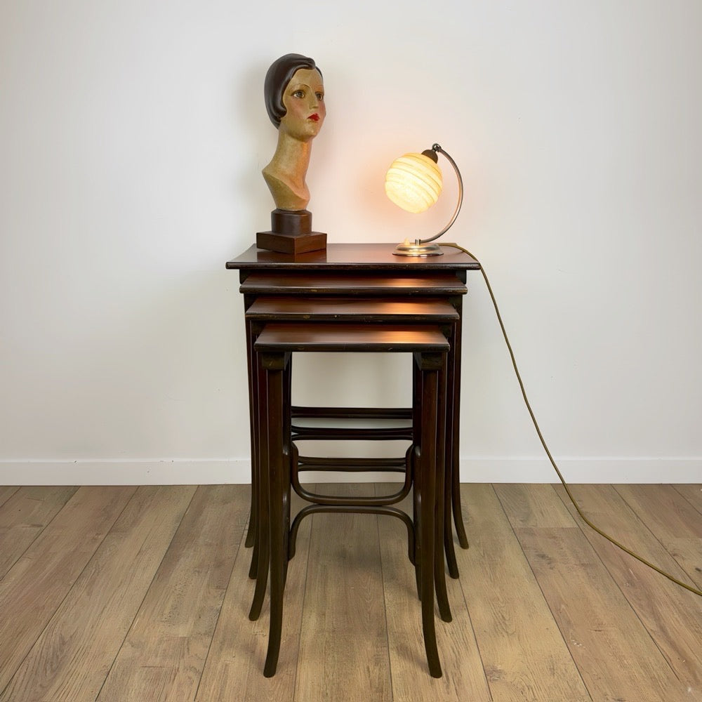 Voici un rare ensemble de quatre tables gigognes en bois courbé Thonet, modèle n°10, réalisé vers 1900, emblématique de l’excellence de la célèbre manufacture viennoise. On ne trouve pas souvent l'ensemble complet.