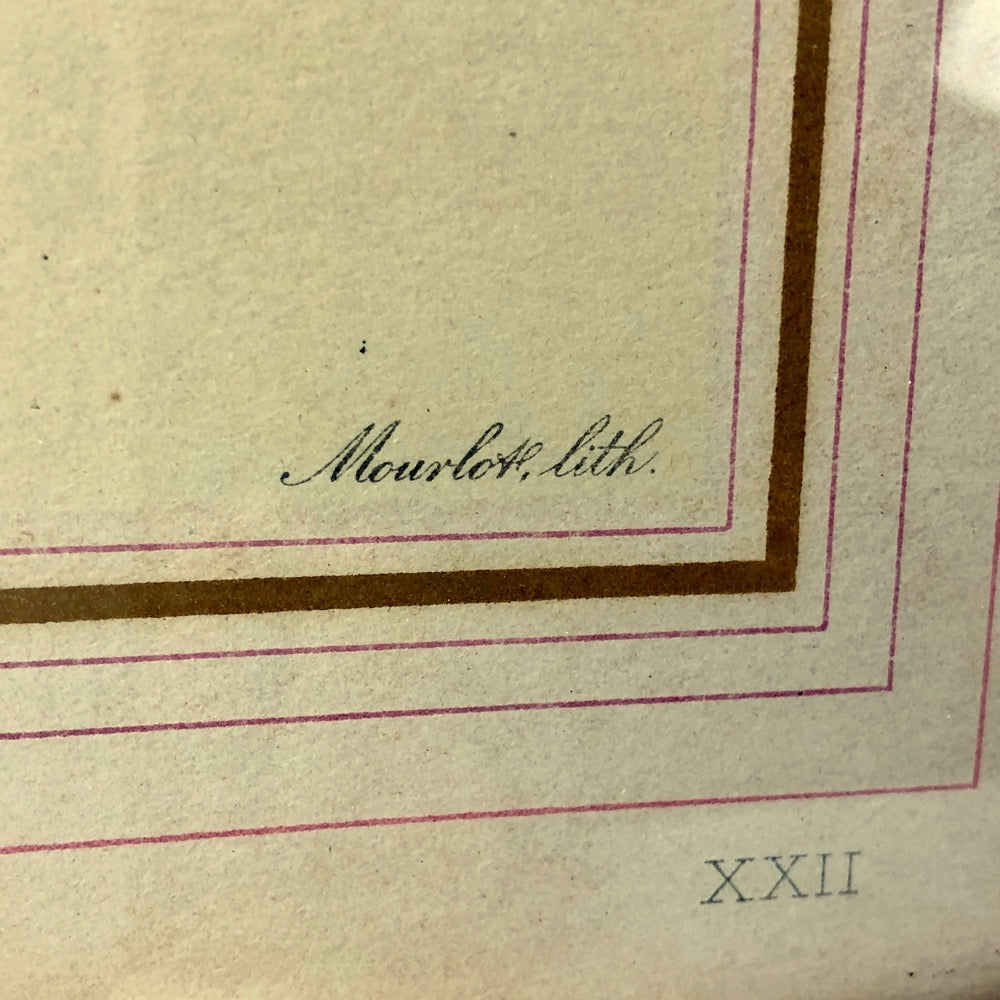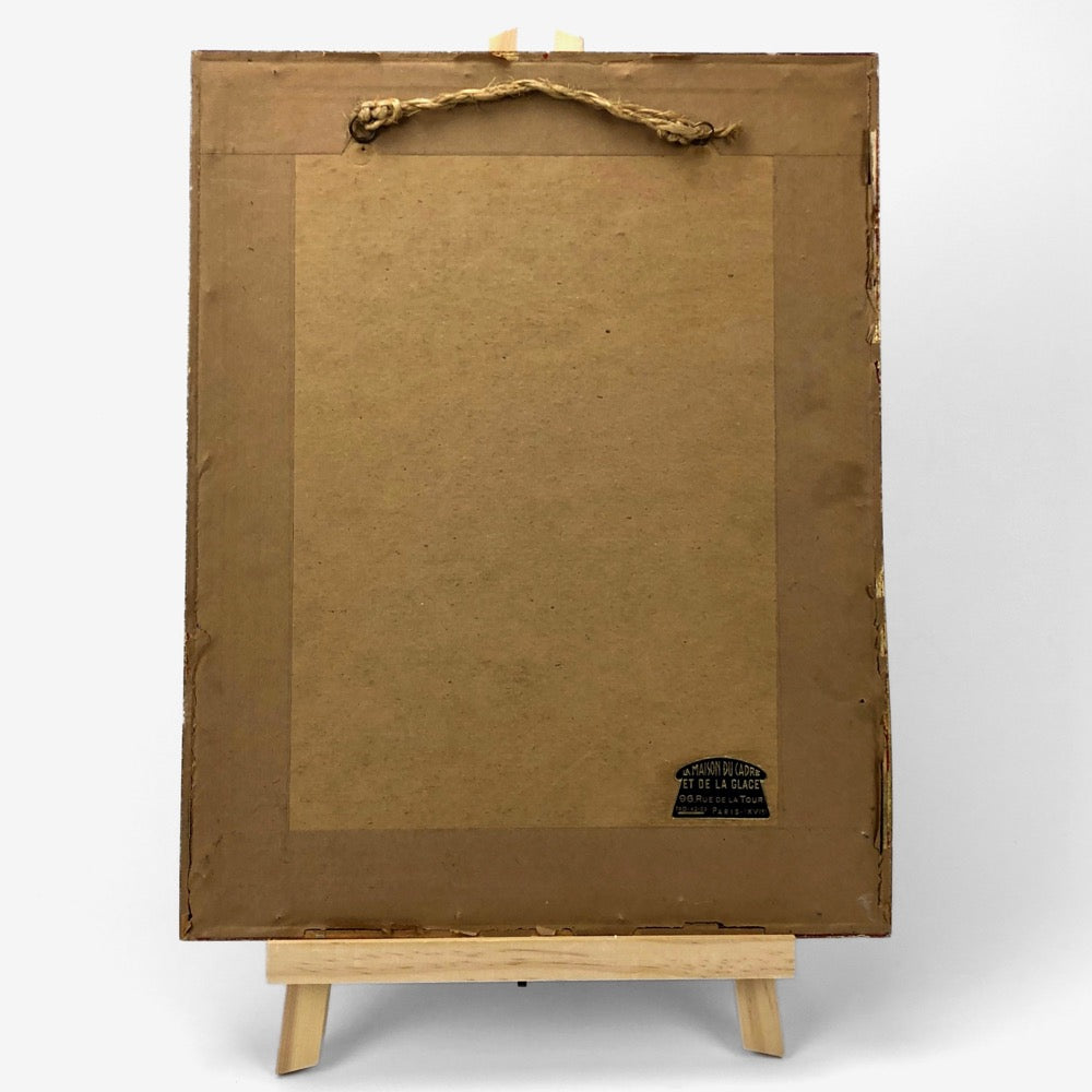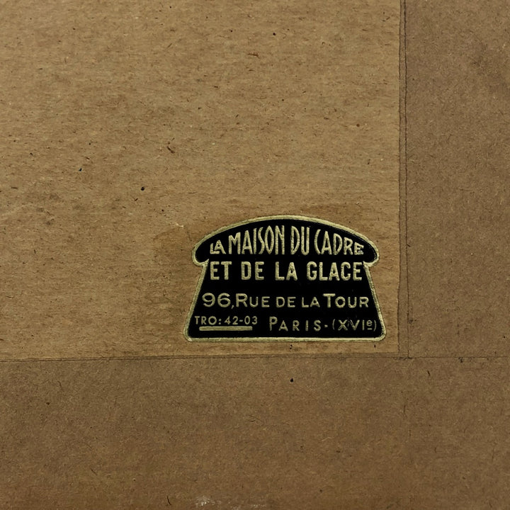La lithographie ainsi que le cadre doré d'origine sont en parfait état. On peut même voir à l'arrière l'estampille de l'encadreur parisien du XVIe dont le numéro de téléphone Trocadéro 42-03 nous fait faire lui aussi un bond dans le passé...
