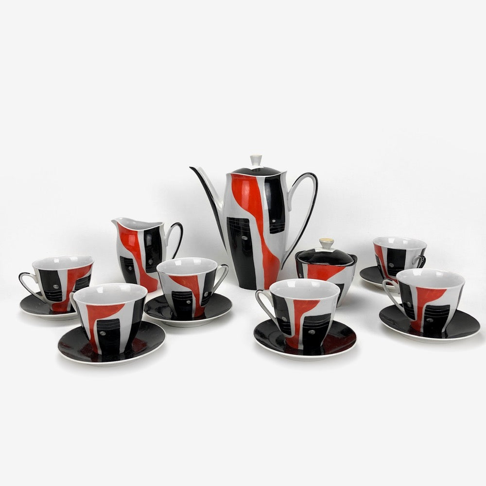 Moderniste, graphique, esthétique, les qualificatifs ne manquent pas pour décrire ce service à café vintage en porcelaine fine de Waldbrzych en Pologne. Loin des thèmes classiques, les 15 pièces qui le composent affichent des motifs abstraits rouges et noirs peints à la main. Le fond blanc de la porcelaine accentue le contraste et lui donne un style résolument artiste.