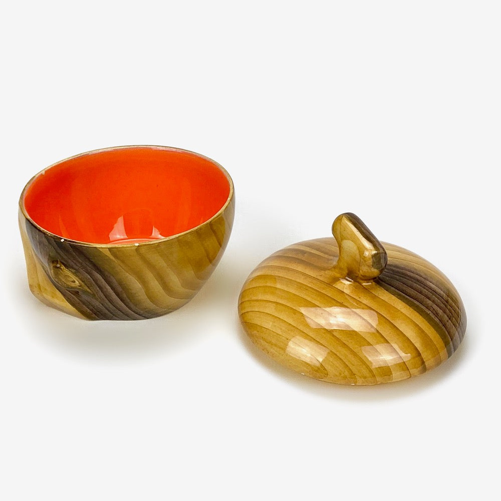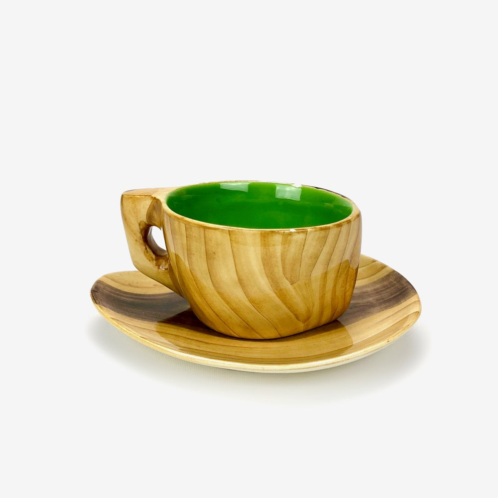 Belle trouvaille que ce service à café Mid-Century de Vallauris. Nous avons craqué pour son originalité, tant au niveau du motif trompe-l'oeil que des formes très stylisées des pièces qui le composent. L'idée d'imiter le bois d'olivier naquit par hasard alors qu'un céramiste cherchait à estomper avec un coton les coups de pinceau des fonds couleur bois d'une de ses céramiques. Depuis, le célèbre motif faux bois a fait la renommée des Grandjean-Jourdan père et fils, Sébastien et Eugène. Les couleurs vives choisies pour l'intérieur des pièces rajoutent une touche de peps au service qui amènera vivacité et jovialité à l'heure du café.