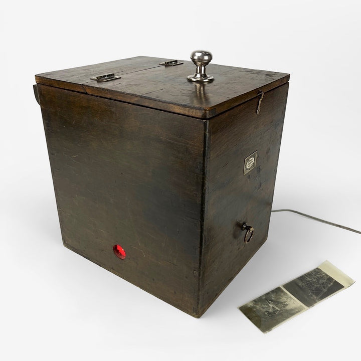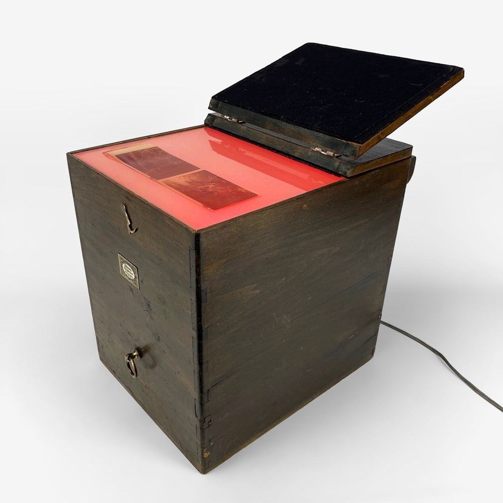Il s'agit d'une tireuse à photo ou contacteuse. Cette boîte en bois avec une vitre, un couvercle sur le dessus et 1 ampoule à l'intérieur, permettait de faire des tirages photo par contact. On mettait en place le sandwich négatif/papier en lumière rouge, et on insolait rapidement avec la lumière blanche. Le fait de refermer le couvercle et de le presser mettait sous tension l'ampoule blanche qui exposait le papier. Une petite tige en métal sur la facade permet de changer l'éclairage (voir vidéo).