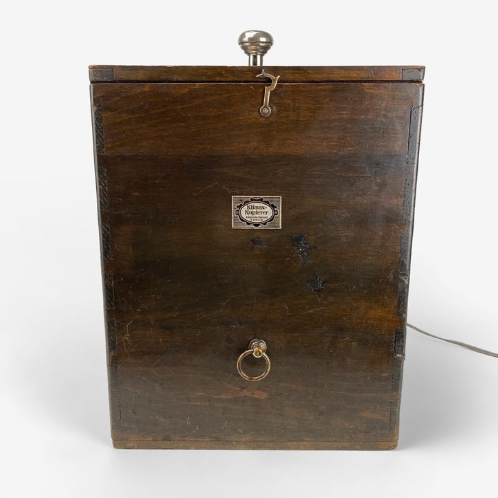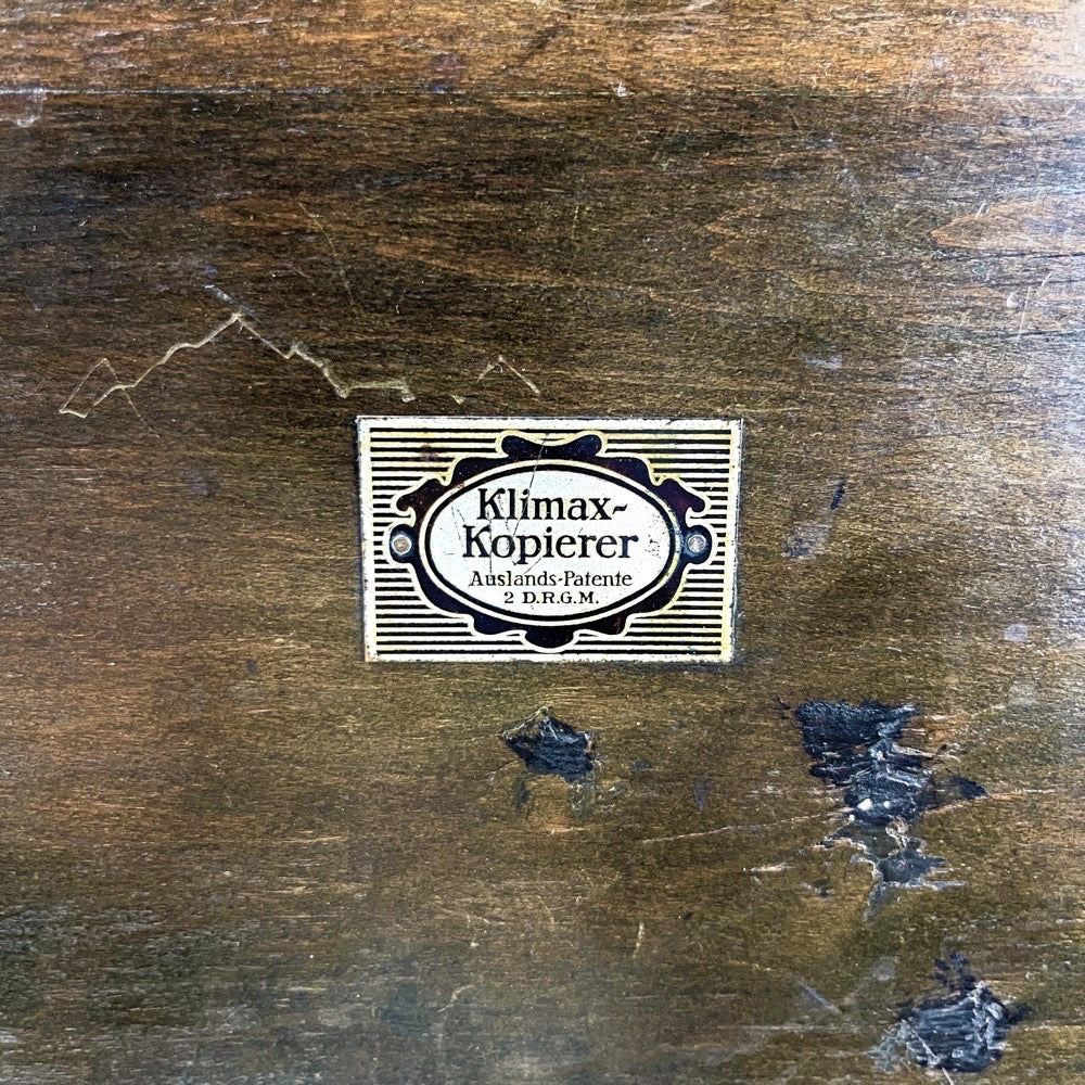 C'est un très bel objet en soi, avec son chassis en bois foncé, ses poignées et ferrures en métal argenté. Sa plaque d'estampille en métal est très belle et toujours présente. C'est un modèle allemand de la manufacture Klimax.