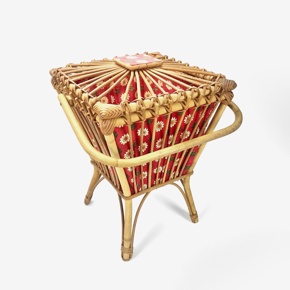 Jolie travailleuse corbeille en rotin typique des années 50 avec son tissu à motif floral d'origine. Légère et raffinée elle gardera amoureusement aiguilles et pelotes de laines ou ustensiles de couture, en s'adaptant élégamment à une ambiance vintage ou scandinave. Très pratique également pour que l'on y range les peluches des enfants sans crainte de les abimer. Elle est en superbe état, à noter le petit carré de tissu sur son couvercle dont le soleil a terni l'éclat.