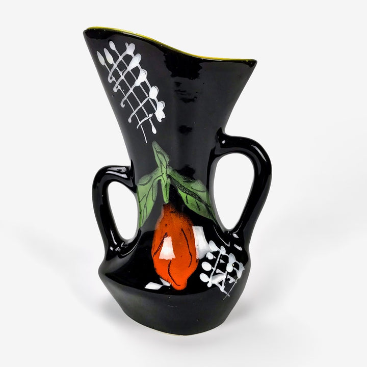 Joli petit vase à anses des années 50 sorti des faïenceries de Poët-Laval. Il est signé Flora. Ses anses décalées, sa forme libre, son motif mi-graphique, mi-floral lui donnent toute son originalité. Son intérieur émaillé d'un jaune résolument canari rajoute du peps à cet objet. Pétillant.